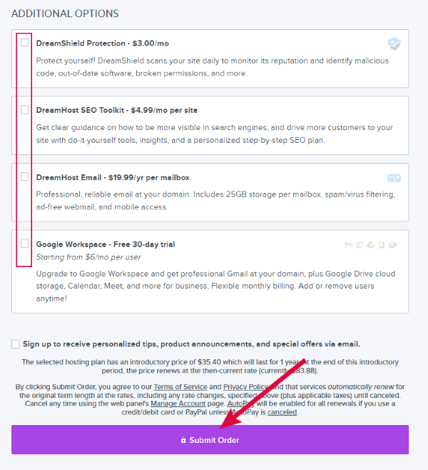 الآن قم بإلغاء تحديد جميع الخدمات الإضافية، ثم قم بالنقر على “Submit Order”